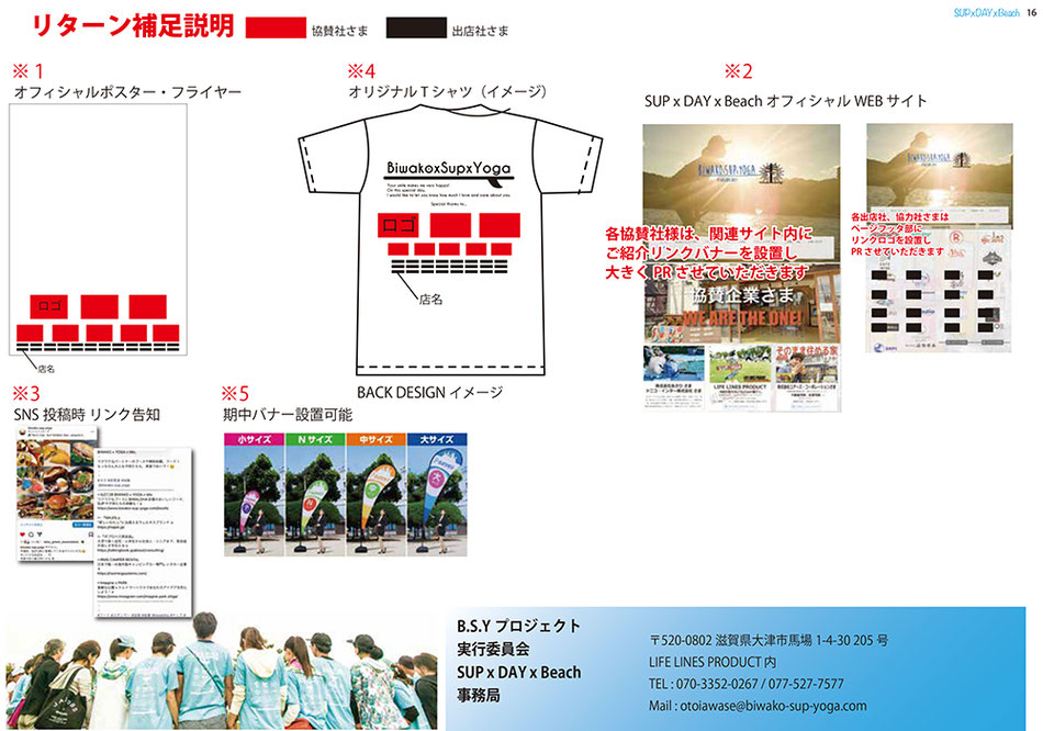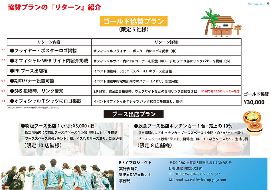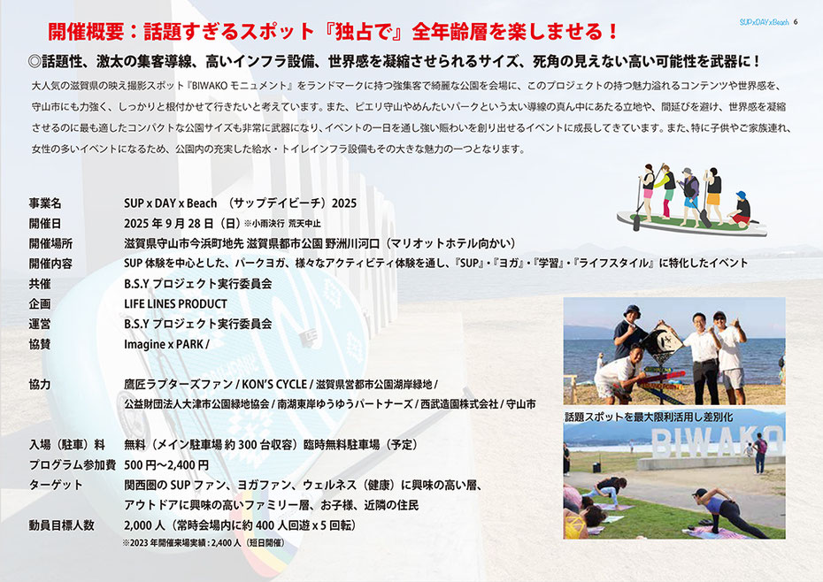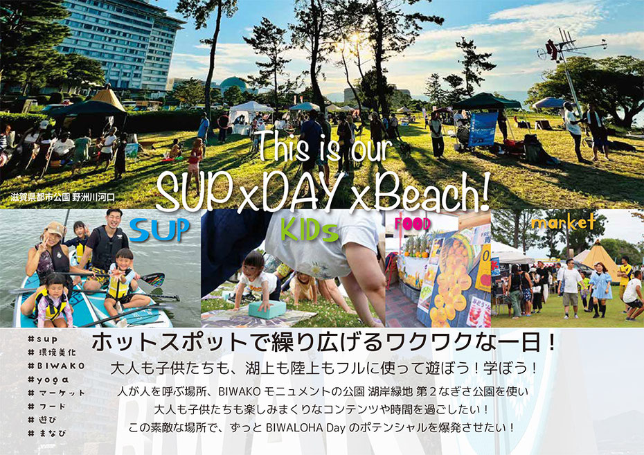 SUP x DAY x Beachでは、BIWAKO、滋賀を通し、大人も子供も、たくさんの笑顔を創り出すイベントを、共に成功に導いていただける協賛者さま、出店者さまを大募集しています。